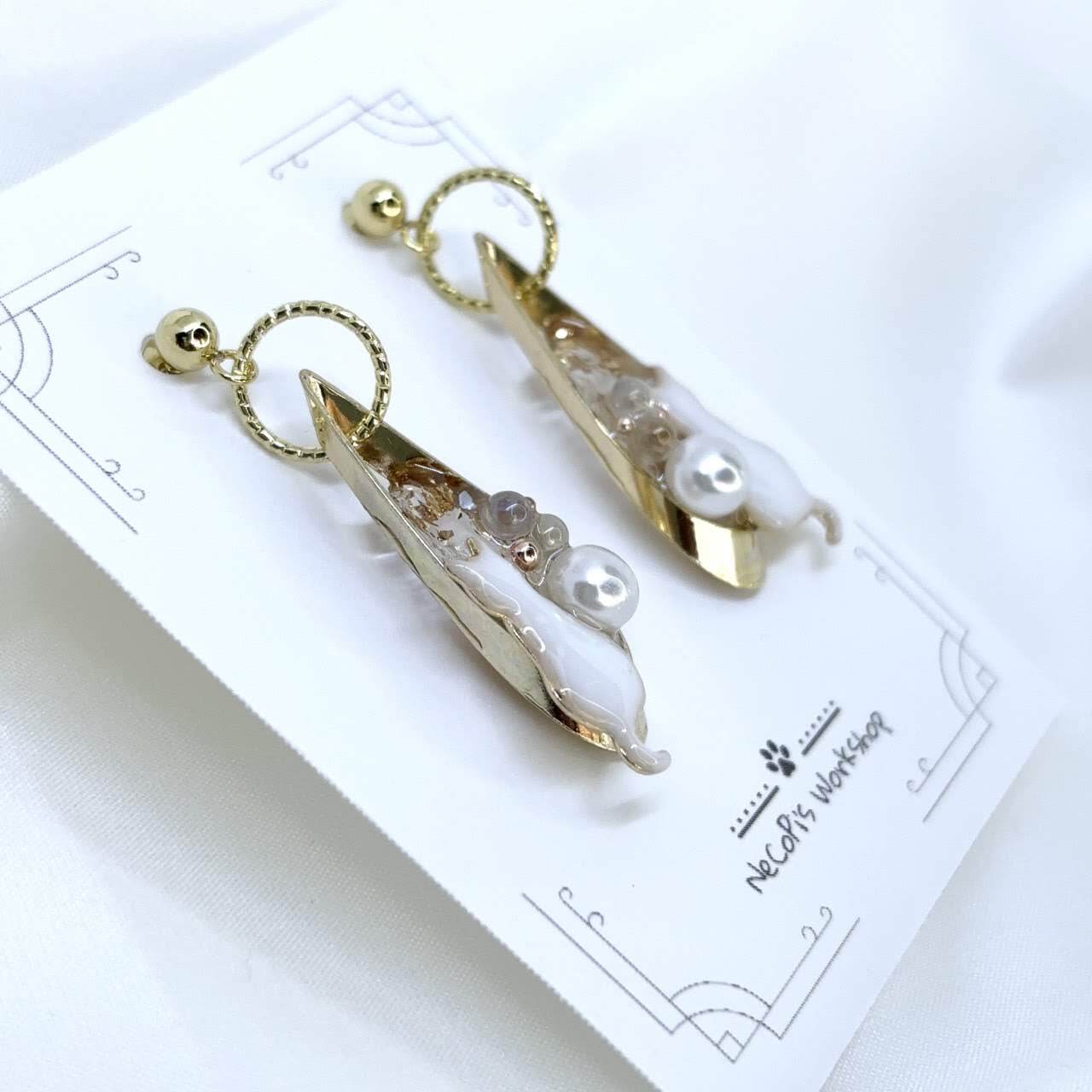 猫パーツの可愛らしさとゴールドと白の上品で華やかな配色が大人かわいい、人とかぶらない印象的なデザインです。