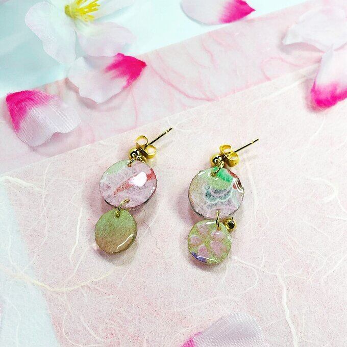 友禅和紙の優しい色合いが耳元でユラユラ揺れる、和の優美な雰囲気を纏ったピアス/イヤークリップです。