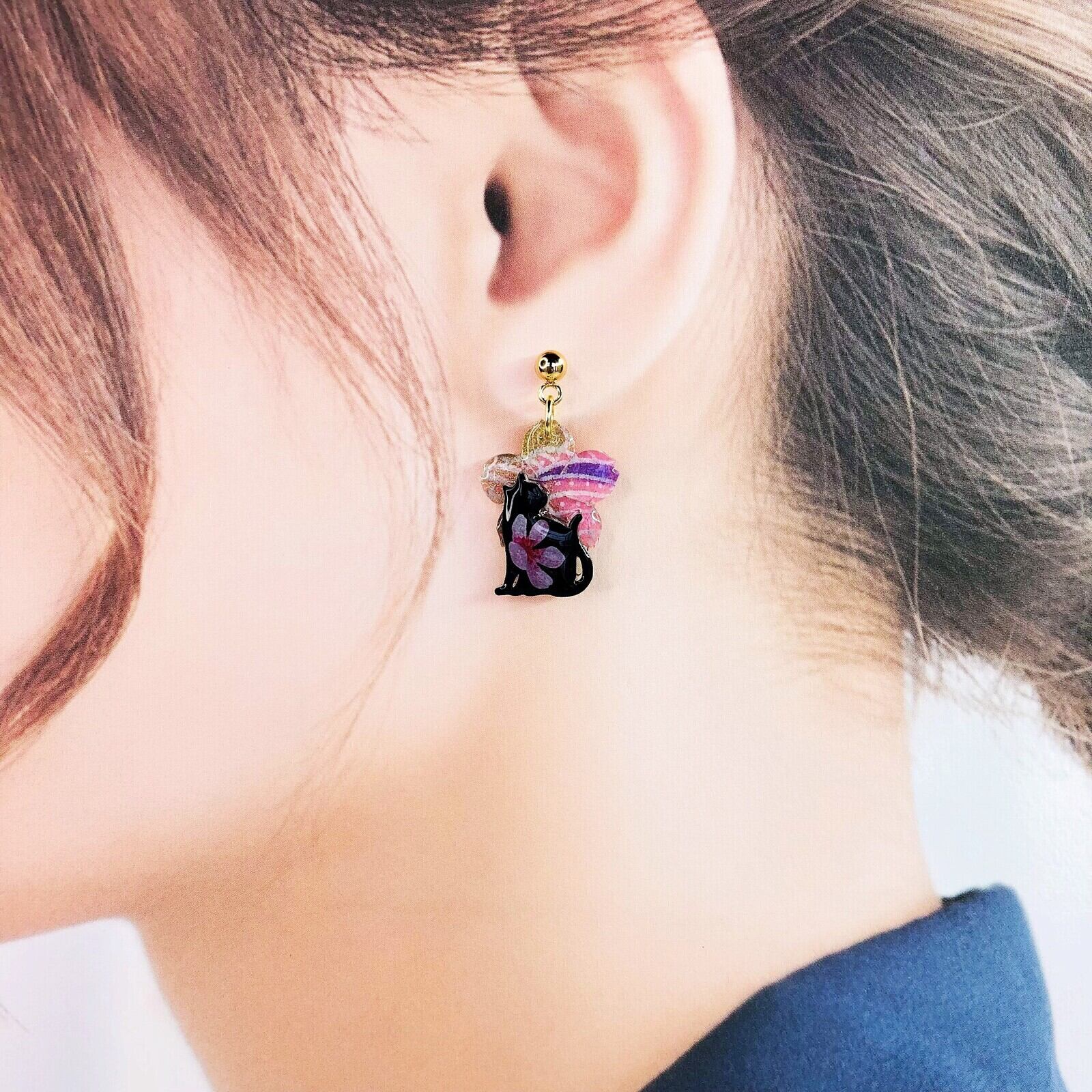 猫アクセサリー 黒猫と和の心 猫モチーフ 友禅和紙×プラバン ピアス/イヤークリップ