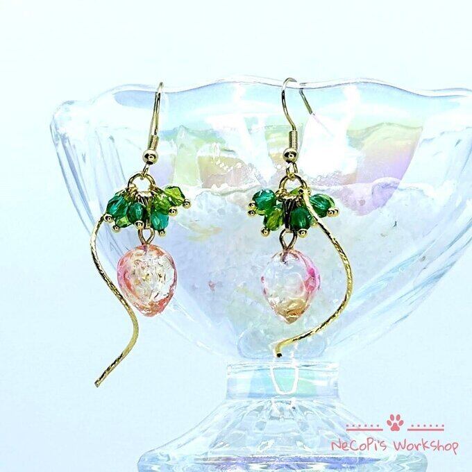 つややかな見た目のいちごチャームに少しずつ色味が違う3色の緑色チェコビーズを葉っぱに見立て、ゴールドのウェーブスティックパーツを組み合わせたゆらゆら揺れるファンシーに大人かわいさをプラスした女子力満点のピアス/イヤリングです♡♡♡