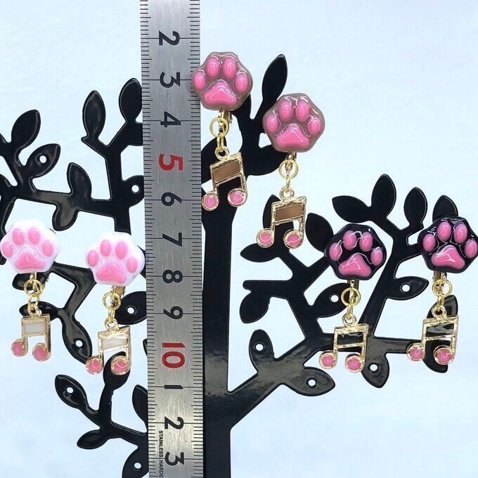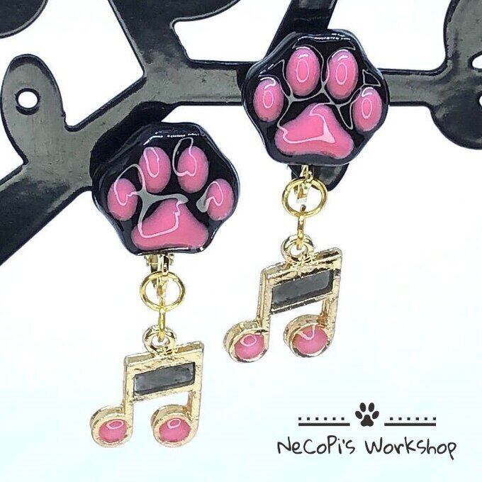 猫アクセサリー 猫 肉球 イヤリング あのコのおてて 黒×ピンク&ユラユラ音符 レジン イヤリング