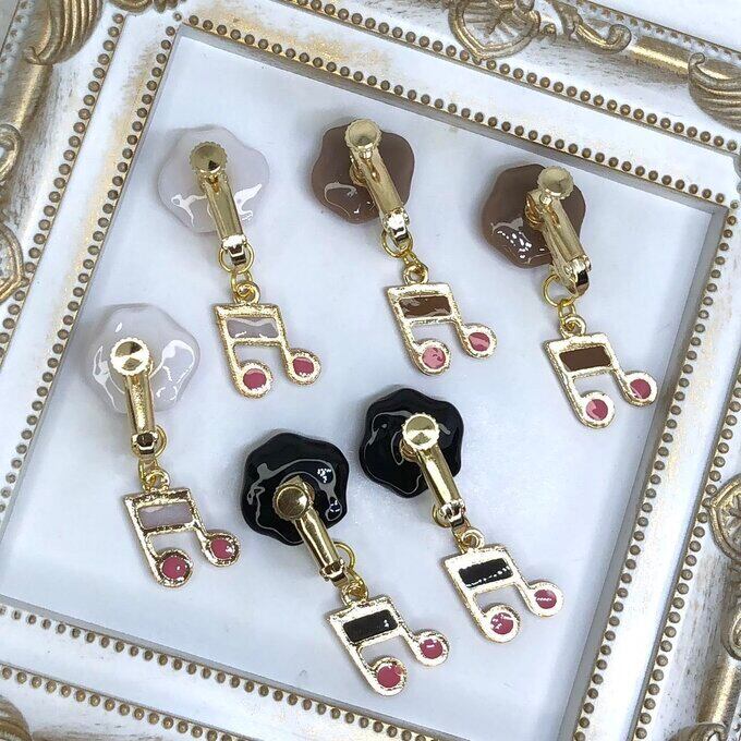 ぷっくりツヤツヤなあのコのおてて 黒×ピンク(小)の下で黒とピンクで色付けした音符チャームがユラユラ揺れるイヤリングです。